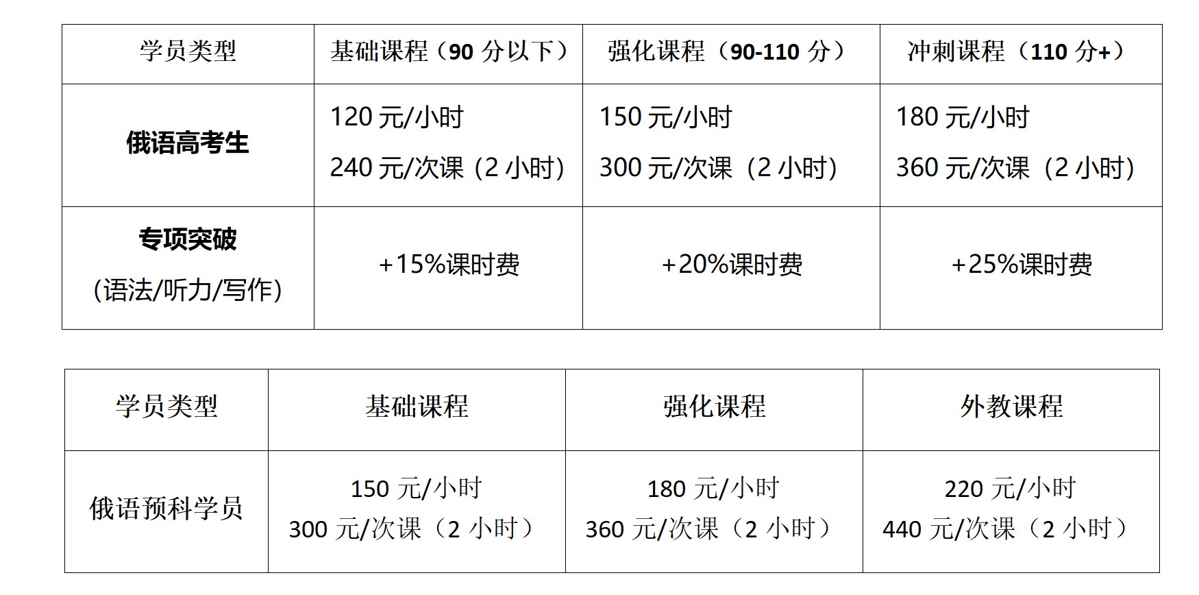 差异化标准:基于学员俄语基础(高考分数/预科入学测试)、目标难度(高考冲刺/预科衔接)及课程类型(基础巩固/专项突破)分层定价